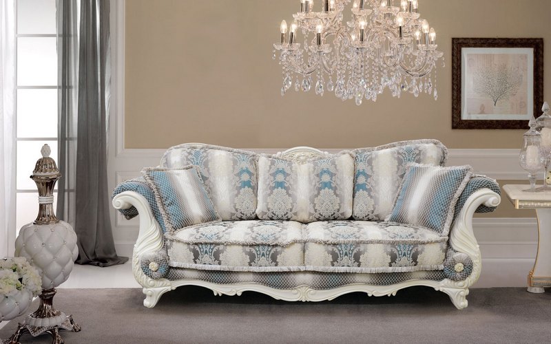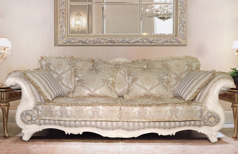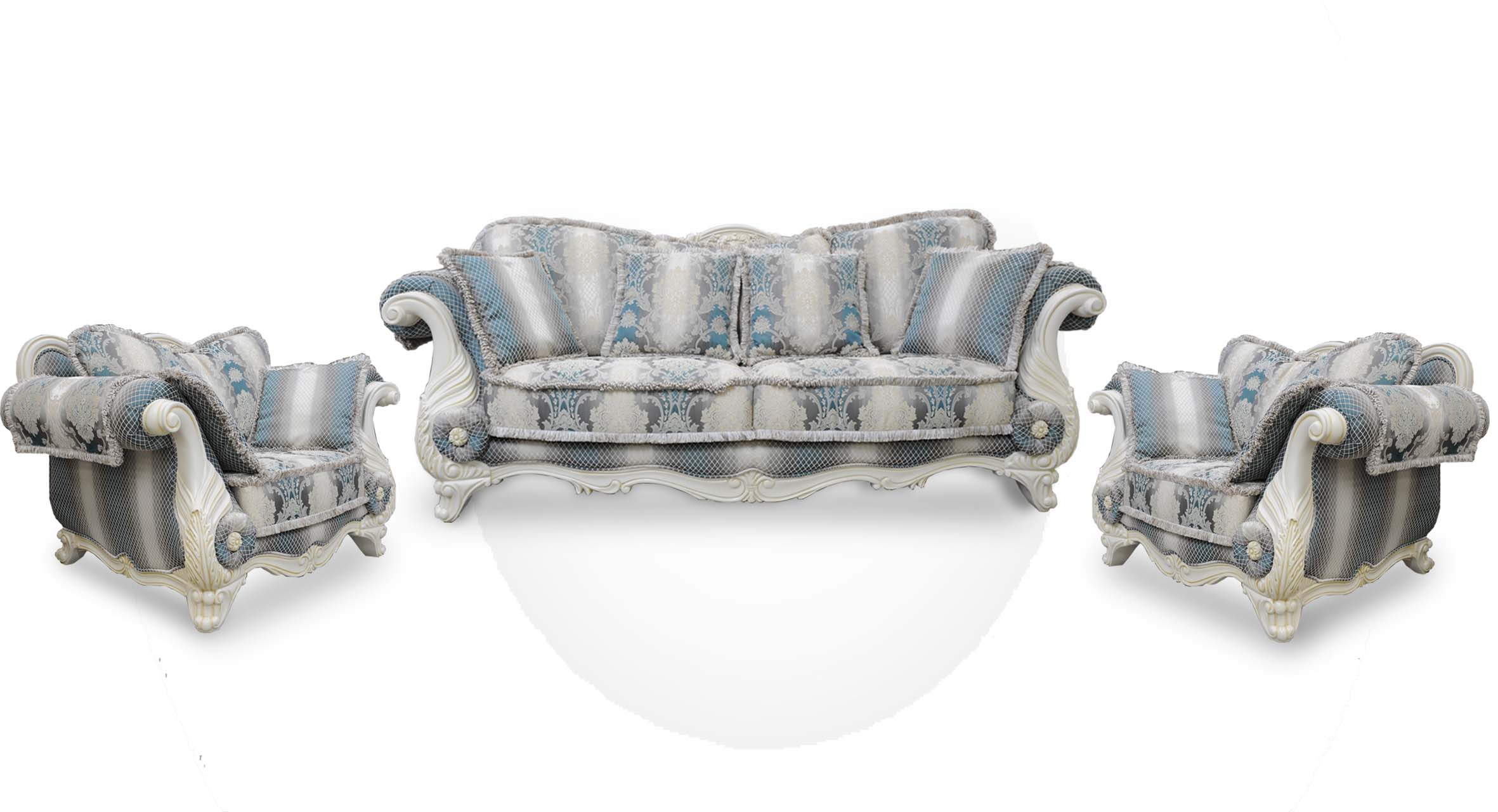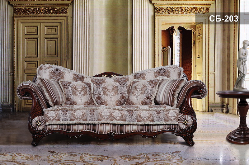 Розкішний і комфортний тримісний диван СБ-203 наповнить ваш будинок благородством та елегантністю класики. Міцний каркас з майстерним різьбленням оперізує диван по периметру. М'яка жакардова тканина з класичним малюнком створює неповторний привабливий образ, а окантування подушок і накидок бахромою надає дивану деяку загадковість та ніжність.