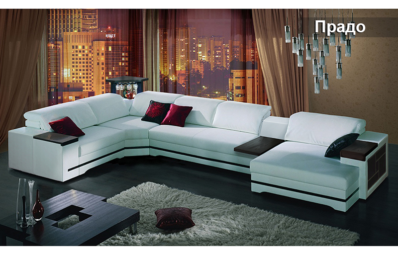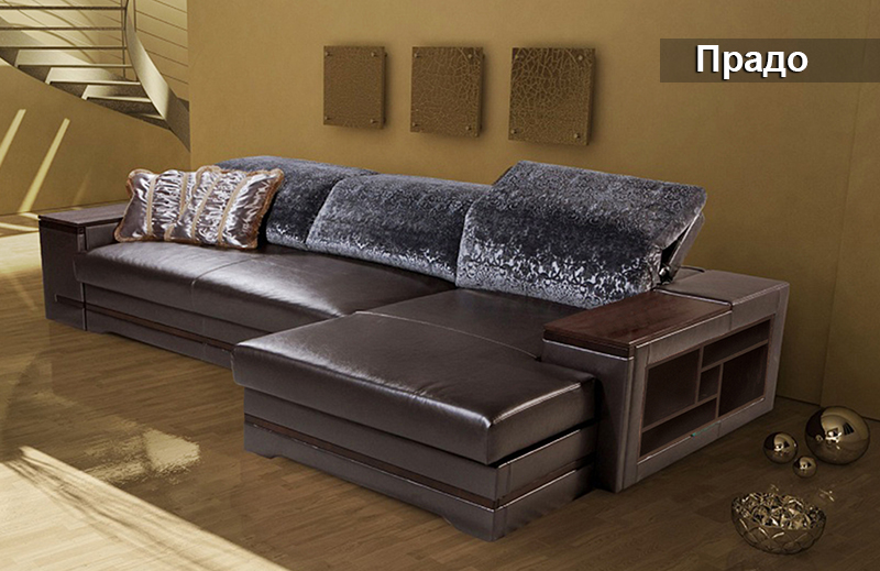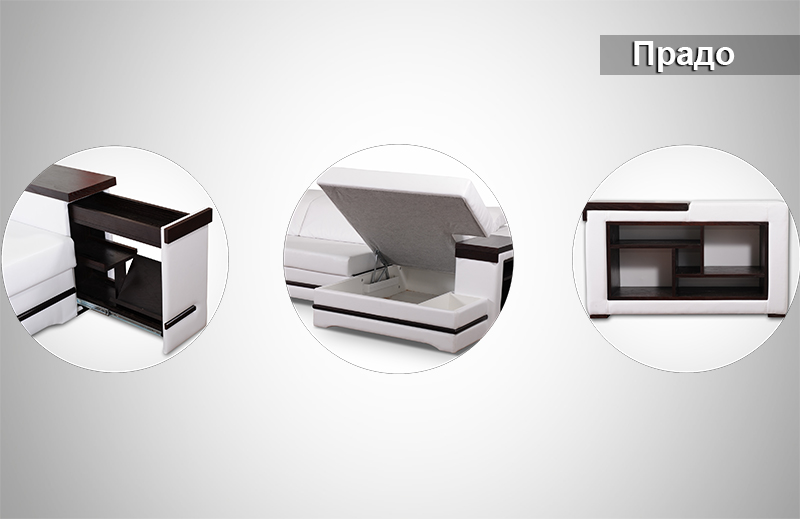 Стильний функціональний дизайн та прямі форми комплекту Прадо не залишать Вас байдужими. Широка спинка та зручні регульовані підголівники дозволять відчути переваги цієї моделі. Підлокітники, представлені в 3-х варіантах виконання, доповнюють лаконічний прямокутний силует. Завершують ідеальну композицію – декоративні накладки з натуральної деревини та полиця кутової частини.