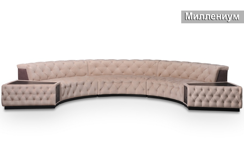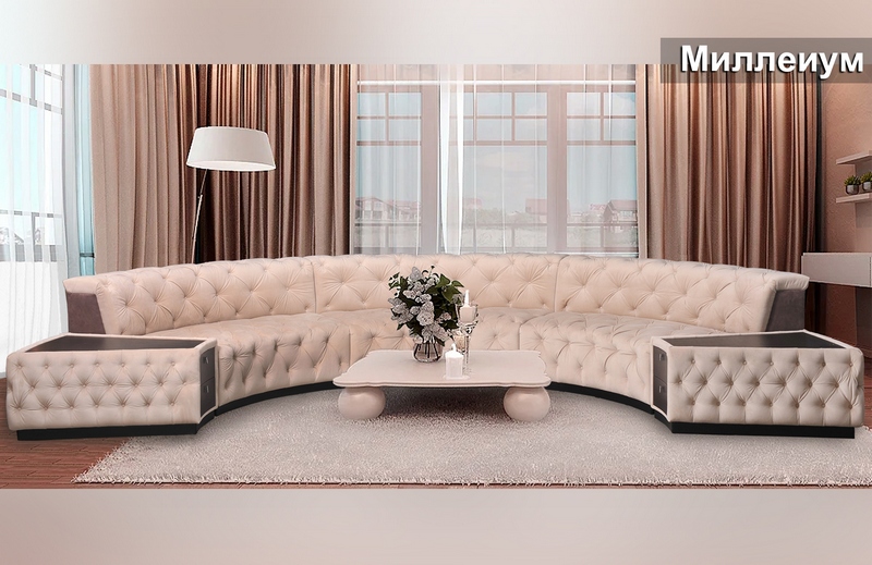 Комплект Мілленіум ідеально поєднує в собі чарівну креативність у поєднанні з неперевершеною якістю. Плавні лінії каркасу та відсутність гострих кутів сприяють розширенню простору та зануренню в атмосферу спокою і затишку. Периметр столу та приставної полиці, а також сидіння та спинку дивана прикрашає об'ємна каретна стяжка, майстерно виконана вручну. Приставні полиці, для зручності, оснащені висувними ящиками, а декоративні подушки-валики доповнюють дизайн виробу.