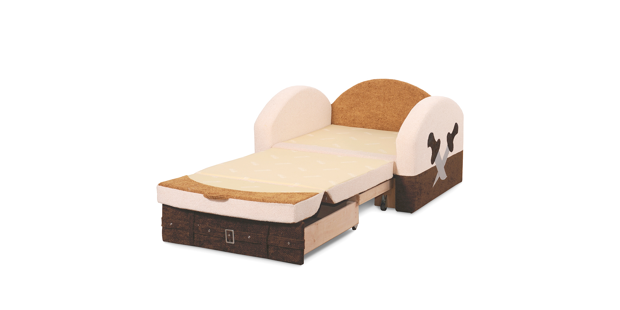 Характерною особливістю виробу є викочуваний механізм, завдяки якому, висунувши нішу і опустивши на неї верхню частину сидіння і спинки, ми отримуємо зручне спальне місце.
