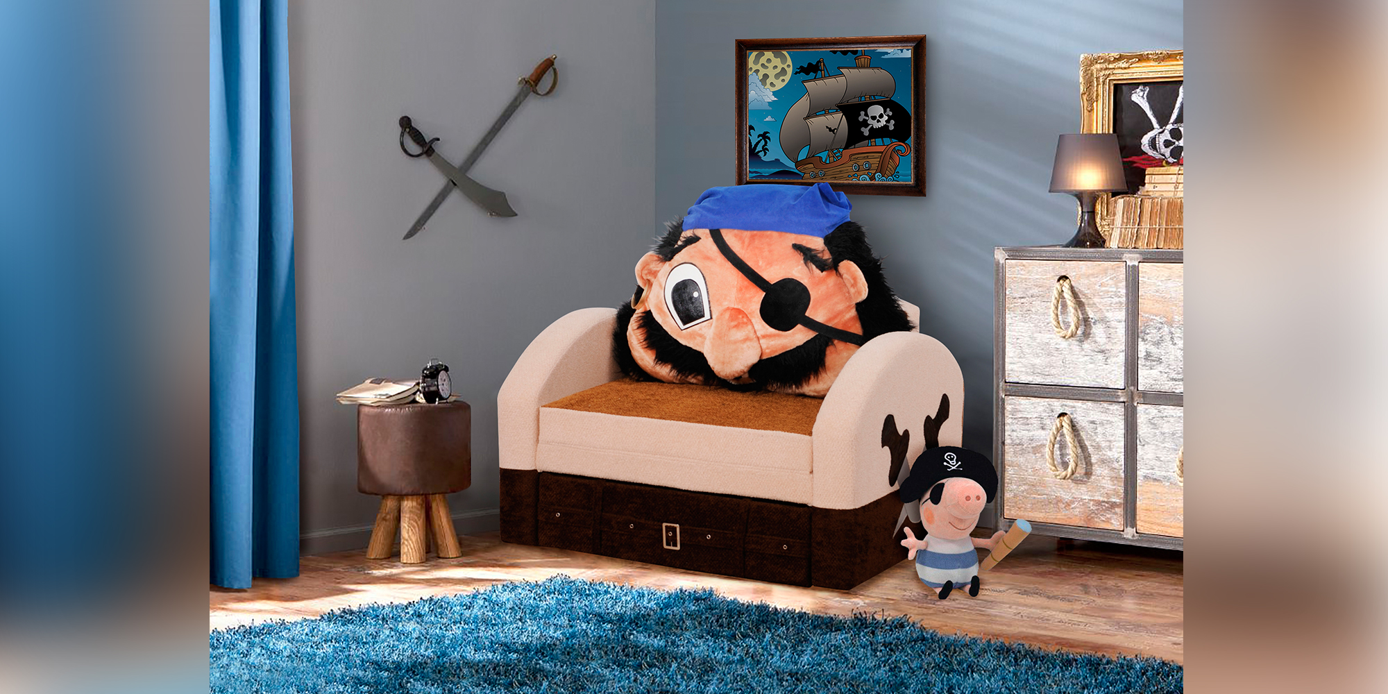 Миле крісло «Джипсі-20» не лише прикрасить дитячу, а й стане справжнім другом Вашій дитині. Виріб виконаний у вигляді «Пірата», який так і манить вирушити у захоплюючу морську подорож, відкривати нові землі та шукати приховані скарби. Зовнішні частини боковин красиво декоровані тематичною аплікацією у вигляді кинджалів, а передню панель прикрашає декоративний ремінь, що додає моделі оригінальності.