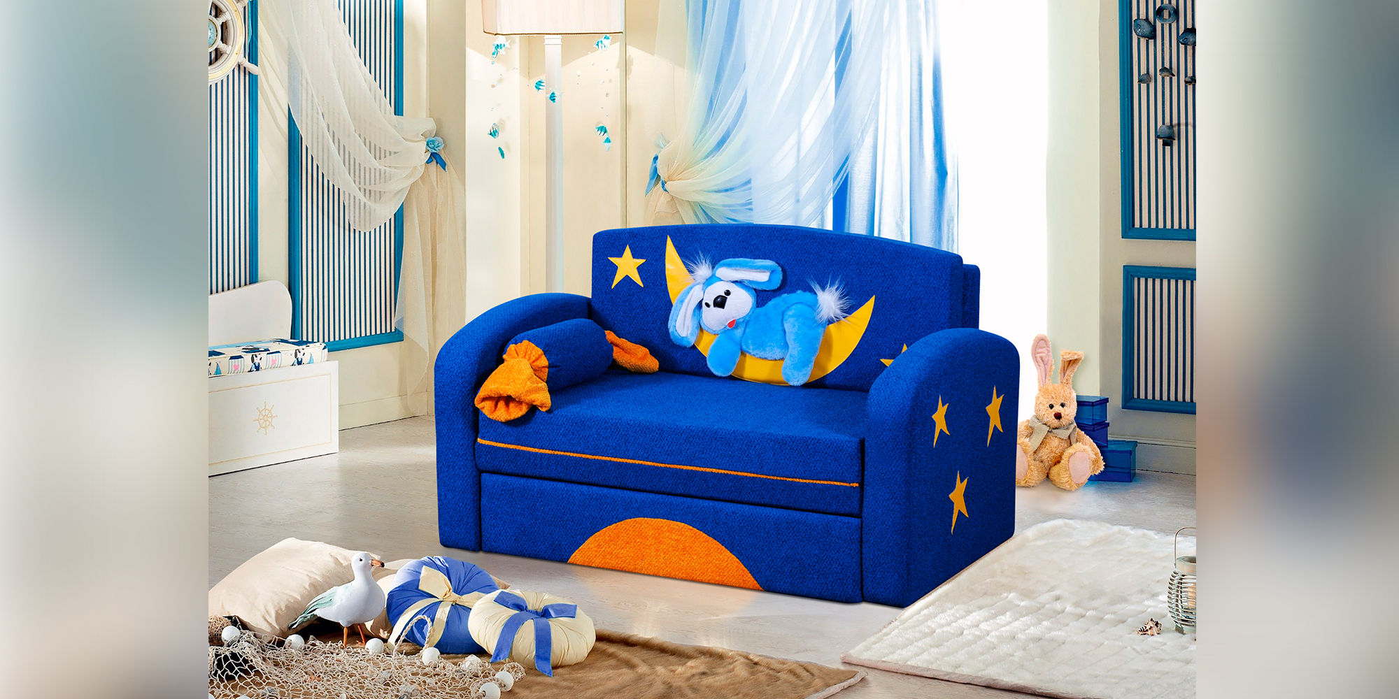 Миле крісло "Джипсі-21" ідеально впишеться в будь-який інтер'єр дитячої кімнати. Стильний дизайн, з аплікацією у вигляді сплячого «Зайченя на місяці» з розсипом «зірочок» та солодкою подушечкою - «Цукеркою», щодня радуватиме Вашу дитину.