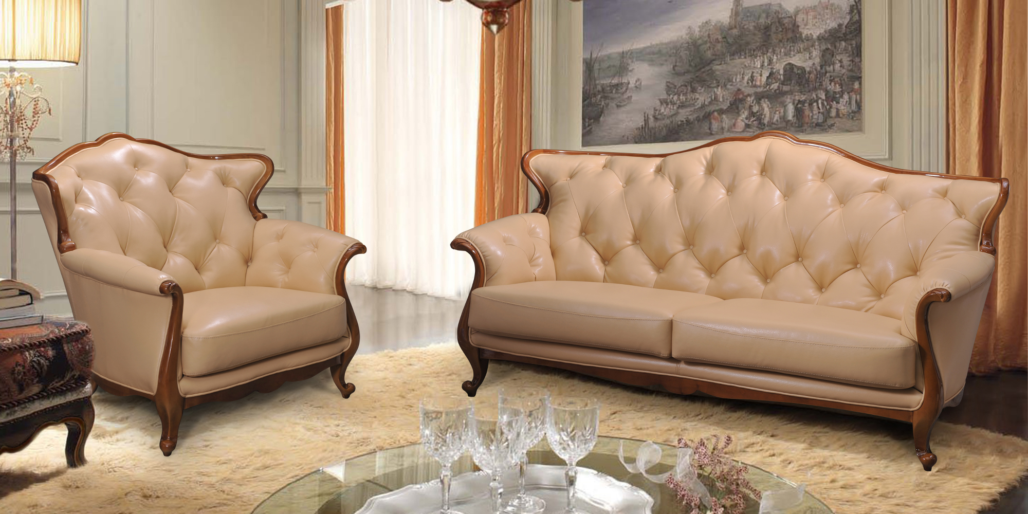 Класичний комплект Ланкастер перетворить і прикрасить будь-який респектабельний інтер'єр. Міцний каркас, виготовлений з масиву натурального дерева, опоясує виріб по периметру. Плавні вигини лінії спинки і підлокітників, а також вишуканий стібок капітоне, на внутрішніх частинах, надають меблям розкішний і граціозний вигляд. Застосування як наповнювач розпушеного холлофайбера, забезпечує спинкам і боковинам м'якість та комфорт.