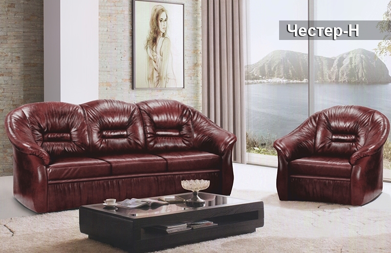 Комплект Честер-Н це ефектна модель, яка вигідно доповнить сучасний інтер'єр будь-якого стилю. Він створений для того, щоб Ви насолоджувалися комфортним відпочинком у колусім'ї або компанії друзів. Обтічні форми, глибокі утяжки на спинках, ефектна відстрочка сидінь і локітників, декоративне оздоблення царги, задають тон всьому виробу і надають йому унікальності та неповторності. М'які локітники на боковинах, що плавно переходять у спинку, надають відчуття затишку, дозволяючи Вам розслабитися і насолоджуватися відпочинком.