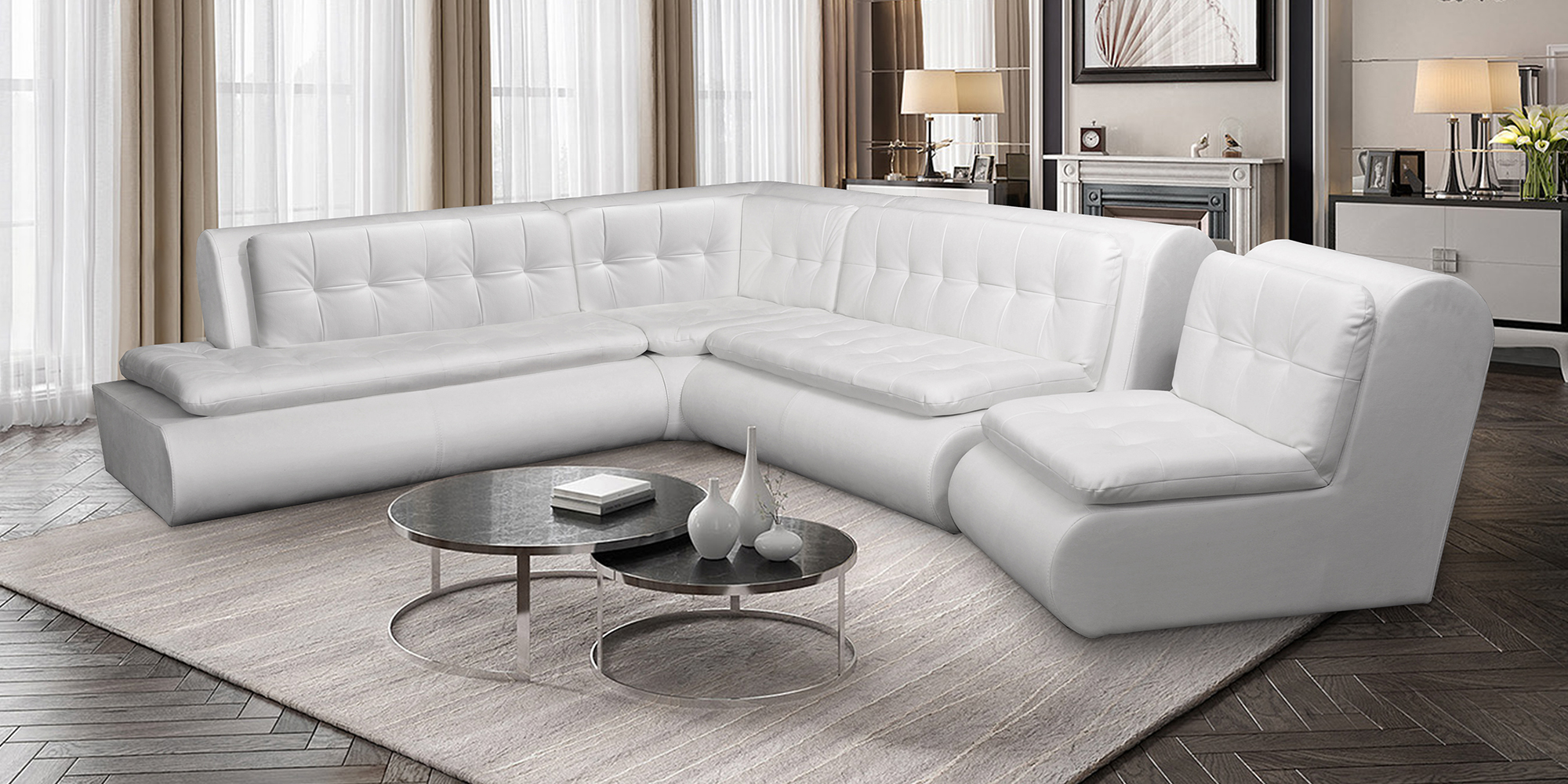 Stylish and modern set Corado-4 will perfectly complement your living room. Smooth silhouette lines and a comfortable fit will allow you to take the most comfortable position, while deep draws visually emphasize comfort and softness.
