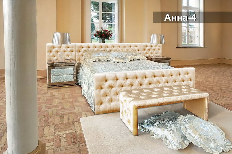 Роскошная кроватьАнна-4 создаст в Вашей спальне неповторимую атмосферу уюта. Несмотря на минималистические формы, модель придает интерьеру респектабельности, наполняя его стилем и комфортом. Изголовье и изножье кроватей, а также периметр кровати со стеганым основанием, эффектно декорировано стяжкой капитоне, что придает изделию неповторимый шарм.