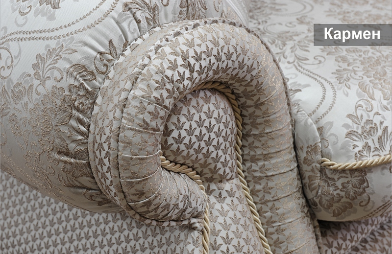 Роскошный комплект Кармен, в классическом стиле, это олицетворение шика и респектабельности. Обтекаемые формы подлокотников и имитация декоративных накладок по периметру нижних частей изделий придают силуэту неповторимую изысканность. Волнообразные вертикальные утяжки красиво разделяют спинки пополам. Мягкие складки изящной драпировки украшают передние панели и передние части подлокотников, а декоративный кант на подушках сидений, подлокотниках и передних панелях придает элегантность и подчеркивает аристократическое происхождение мебели.